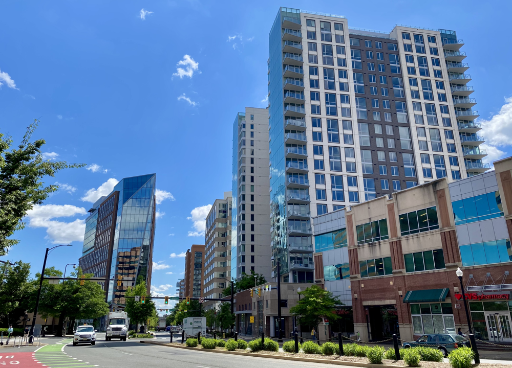 Modern high-rise buildings along Clarendon Blvd in Arlington’s Rosslyn-Ballston corridor reflect the urban appeal of neighborhoods like Courthouse, Clarendon, and Ballston. These areas offer walkable city living with shops, restaurants, and easy Metro access.